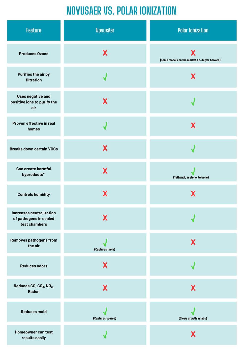 Neither the NovusAer or Bipolar Ionizers remove or reduce carbon monoxide, carbon dioxide, nitrogen dioxide or radon gas from the air.